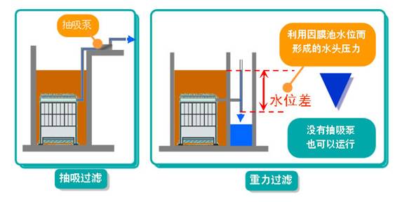 一般采用的膜过滤方式为抽吸过滤。液中膜(平板膜)除了抽吸过滤以外,还可以实现不需要抽吸泵的重力过滤和虹吸过滤。