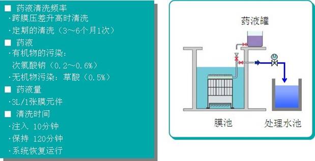膜分离装置必须得做药液清洗。液中膜(平板膜)可实现在线清洗,因此药液清洗时无需将膜从膜池吊出。